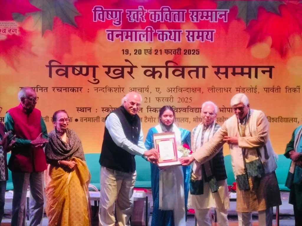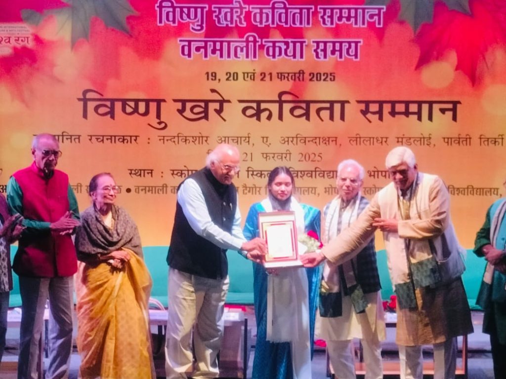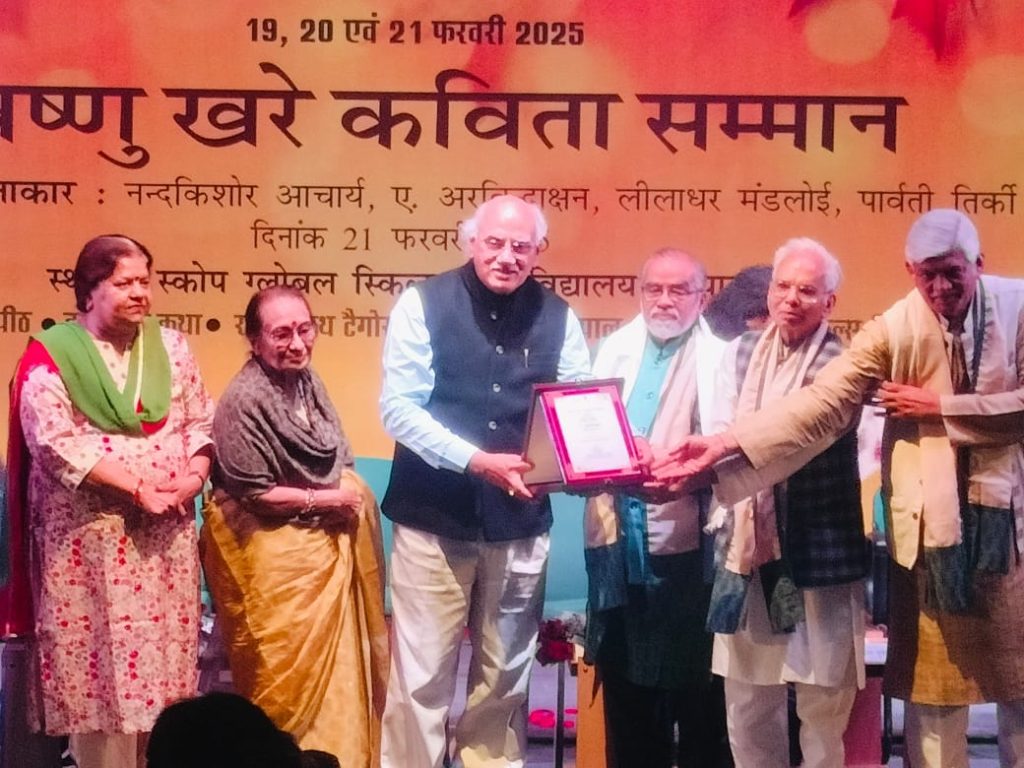 भोपाल। राष्ट्रीय विष्णु खरे कविता सम्मान समारोह का भव्य आयोजन वनमाली सभागार, स्कोप ग्लोबल स्किल्स विश्वविद्यालय, भोपाल परिसर में गरिमामय रूप से आयोजित किया गया। इस अवसर पर कला, साहित्य एवं संस्कृति के लिये समर्पित वनमाली सृजनपीठ द्वारा वनमाली जी के शिष्य एवं प्रखर कवि, आलोचक, अनुवादक, पत्रकार विष्णु खरे की स्मृति में राष्ट्रीय कविता सम्मान से चार अलग-अलग श्रेणियों में रचनाकारों को सम्मानित किया गया। विष्णु खरे आलोचना सम्मान से वरिष्ठ आलोचक, कवि, अनुवादक नंदकिशोर आचार्य (बीकानेर), विष्णु खरे अनुवाद सम्मान से वरिष्ठ अनुवादक ए. अरविंदाक्षन (केरल), विष्णु खरे कविता सम्मान से सुप्रसिद्ध साहित्यकार, कवि, अनुवादक एवं आलोचक लीलाधर मंडलोई (नई दिल्ली) तथा विष्णु खरे युवा कविता सम्मान से युवा कवियत्री सुश्री पार्वती तिर्की (झारखंड) को सम्मानित किया गया।