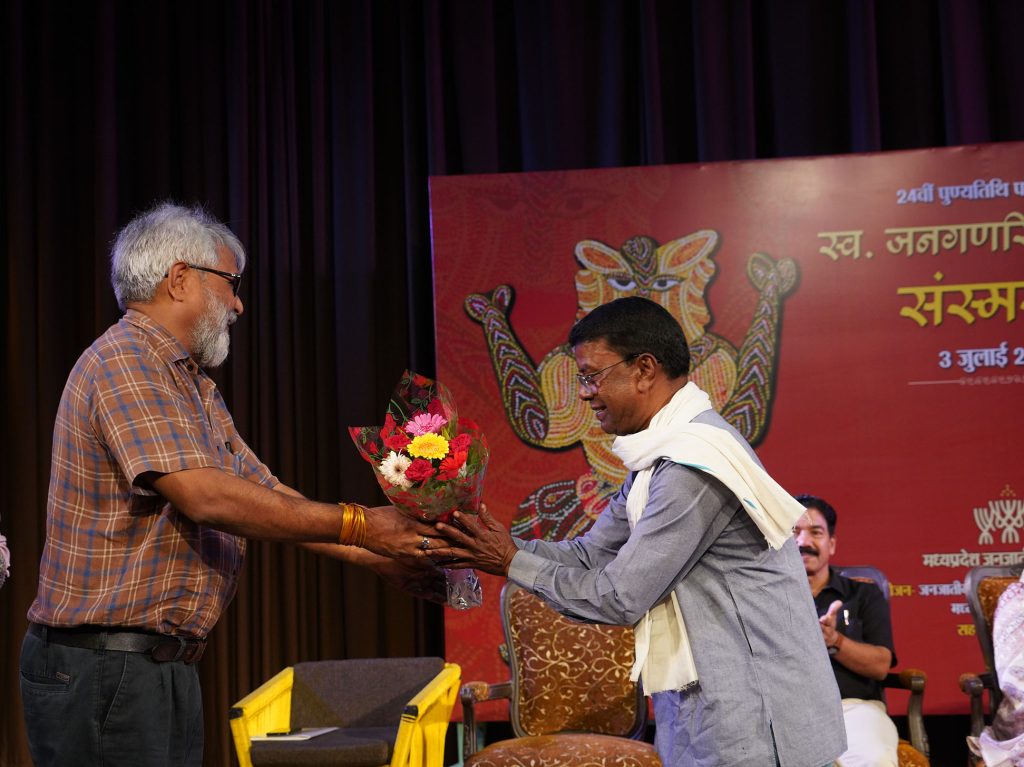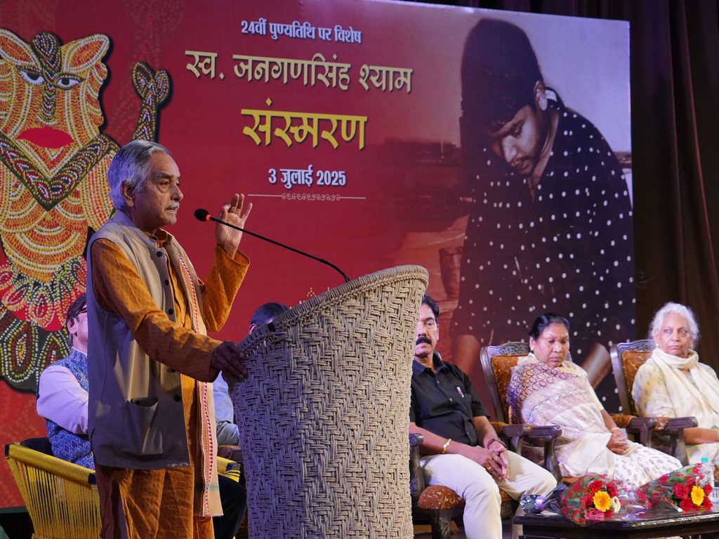 स्व जनगणसिंह श्याम को याद करते हुए वक्ता श्री विवेक टेम्बे भावुक हो उठे। एक स्मृति सभा में बोलते हुए उन्होंने कहा, “आज का सत्र कठिन है, क्योंकि उस व्यक्ति के बारे में बोलना है जो अब हमारे बीच नहीं है।” उन्होंने बताया कि वर्ष 1981 स्व जनगणसिंह श्याम को पाटन से डिंडोरी लाया गया था। उस समय शाम को भोजन के लिए दूर जाना पड़ता था। एक बार जब उन्हें भोजन के लिए साथ चलने को कहा गया, तो जनगण जी ने जवाब दिया कि वह चित्र बनाएंगे। जब भोजन के बाद लौटकर देखा गया, तो उन्होंने दो चित्र तैयार कर लिए थे — एक बड़ा देव पर और दूसरा अपनी स्मृतियों पर आधारित था। श्री टेम्बे ने कहा कि स्व जनगणसिंह श्याम ने कभी किसी की नकल नहीं की, बल्कि हमेशा अपनी मौलिक शैली में चित्रों का सृजन किया। यही उनकी कला को विशिष्ट बनाता है।