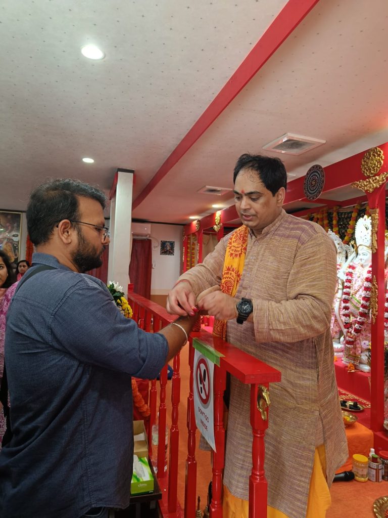 रक्षा सूत्र बांध नकारात्मक शक्तियों से दूर रहने के लिए पण्डितजी से आशीर्वाद लेते भक्तगण